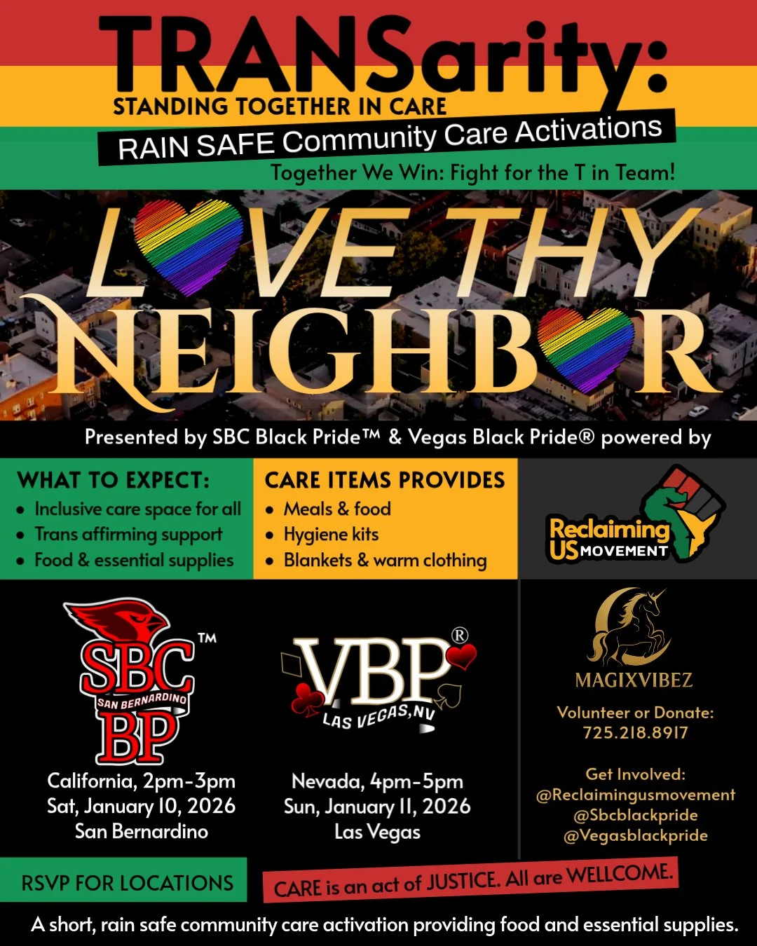 LOVE THY NEIGHBOR: January, 10th through January 11th, we are collaborating with MagixVibez to spread love, dignity, and care across Las Vegas and San Bernardino, County. Delivering wellness packages to our unhoused youth and struggling neighbors during this time of need. Distributions Location is given after you RSVP. More info follow @ReclaimingUsMovement and @VegasBlackPride.